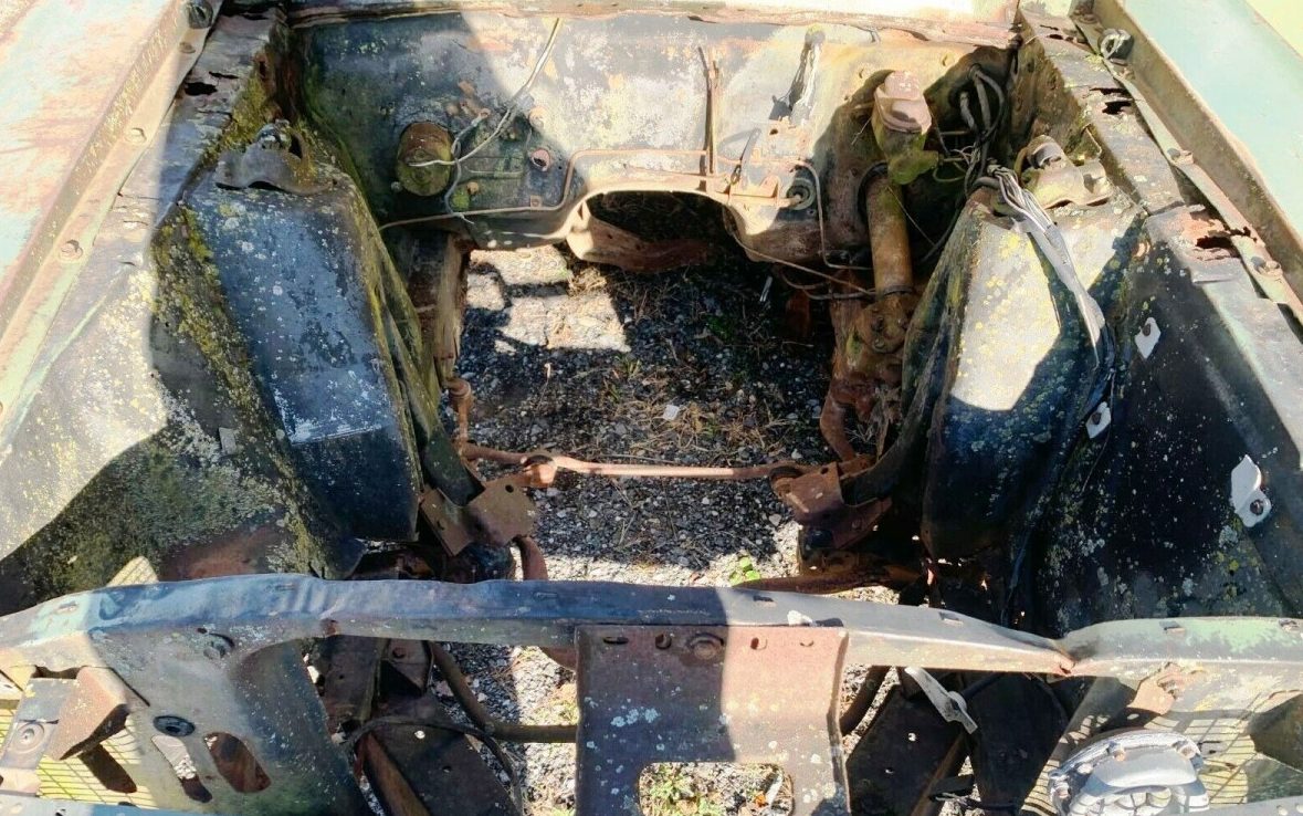 Patches of lichen may have been lured into the engine compartment by the similar hue of the Lime Gold paint. I’m no expert but I thought 390 cars normally have reinforced lower shock towers, not evident here. I have given an abandoned rusty Mustang life after a long hiatus in a field, and generally consider myself an optimist, but this one needs a ton of work. One good point, though: this relic comes with a clean title!