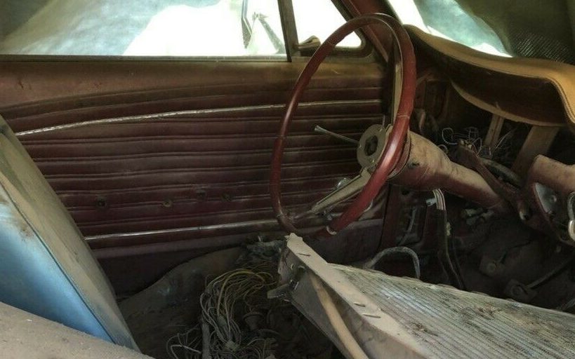 The interior is pretty well trashed. In spite of the Marti report’s claim of red vinyl interior, there is what looks like a blue bucket seat in the driver’s seat location, though the warped door card is, in fact, red vinyl. The instrument panel is gone, lots of loose wiring is visible and there is a radiator haphazardly dumped into the passenger seat position. The photo was snapped with some sort of a cover over the outside of the car so it, and the angle chosen, doesn’t portray a thorough image of the interior. From this vantage point, it looks like a write-off.