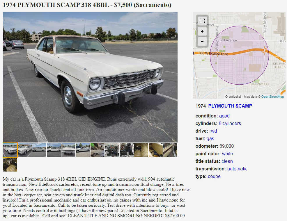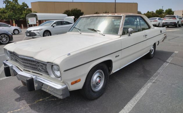 Spinnaker White is the name that Plymouth gave to the color of this 1974 Plymouth Scamp hardtop, and some may argue that white paint isn’t really a color, but a tone or other description. One color we don’t know is what the missing vinyl top was, but I’m guessing it was white, black, or a tan color. The seller has this one posted here on craigslist in Sacramento, California, and they’re asking $7,500. Here is the original listing, and thanks to Barney for the tip!