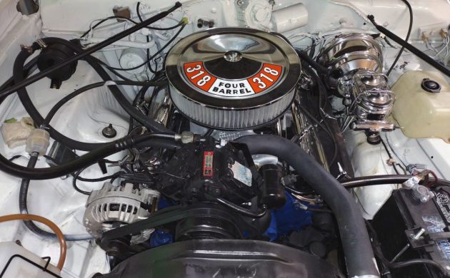 A 318 4 barrel from the factory was a pipe dream in 1974 and a decade or more away but easily achieved afterward — the intake manifold from a 273 four barrel, a 340 or a 360 four barrel is a simple bolt-on proposition.
