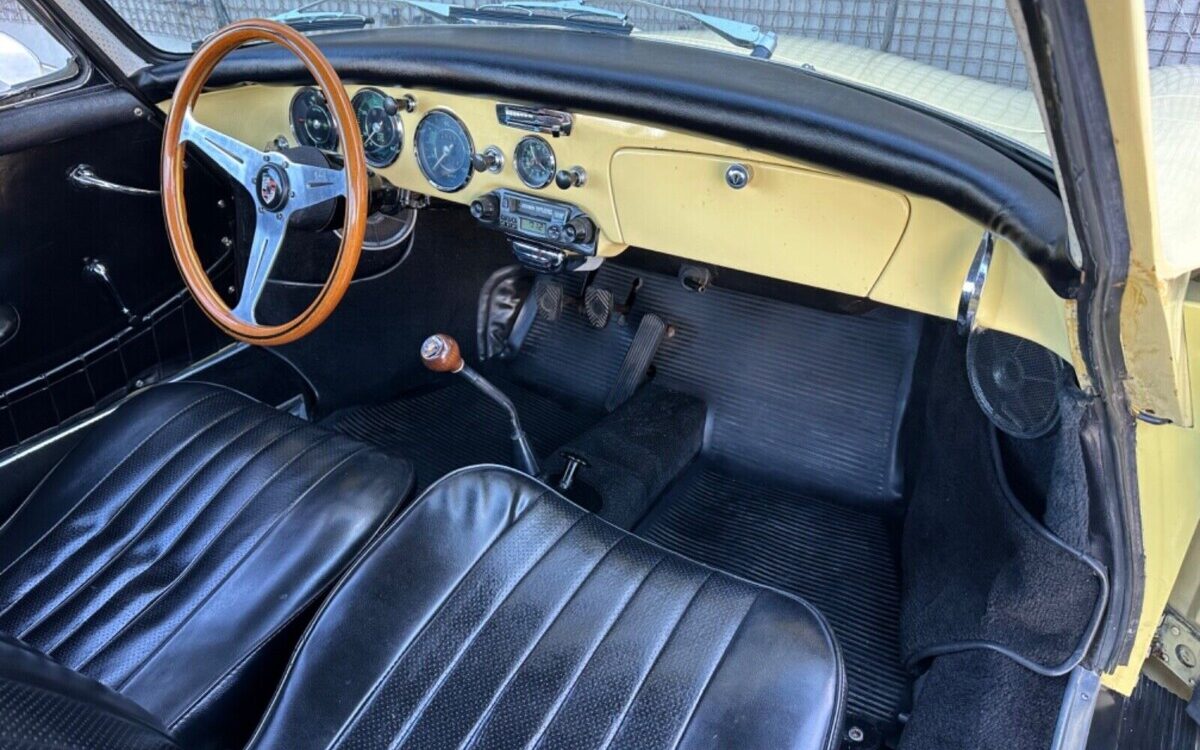 The interior features very nice black, leather-covered seats (they look more like leatherette) and they are in truly fine nick and coordinate well with the floor mat, door cards, and dash pad. The instruments and switchgear are all where they’re supposed to be and the wooden steering wheel is one of the nicest that I have encountered. This is one interior that needs nothing!