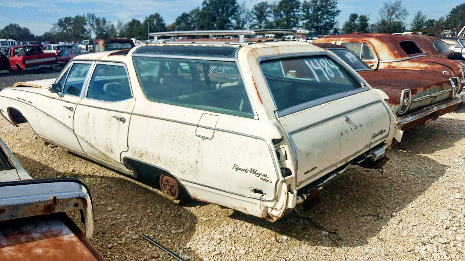 That Buick wagon.. may be too far gone, but what a gorgeous cruiser. Hope someone with the pockets saves it.