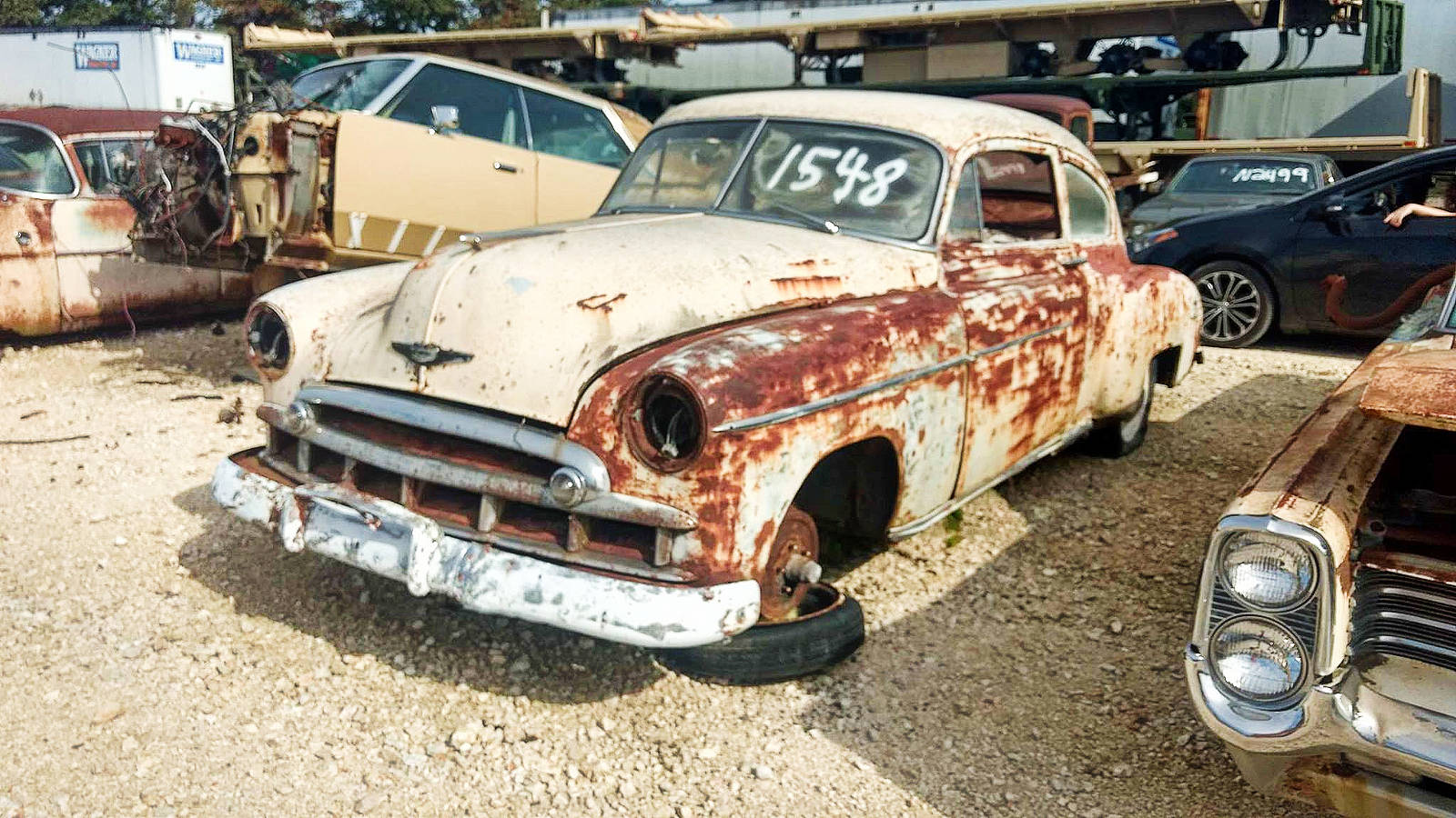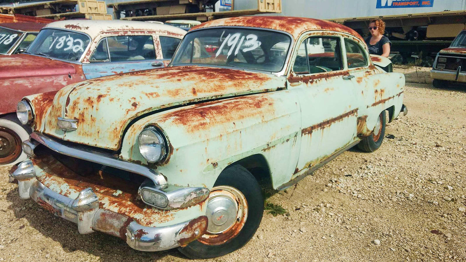 The light blue 2 door 54 chevy looks to be a very rare business sedan . The rear side window looks like it has a rubber gasket all the way around meaning the window doesn’t roll down and the car would have come with no back seat . If it is a real business sedan it could be one of very few left .