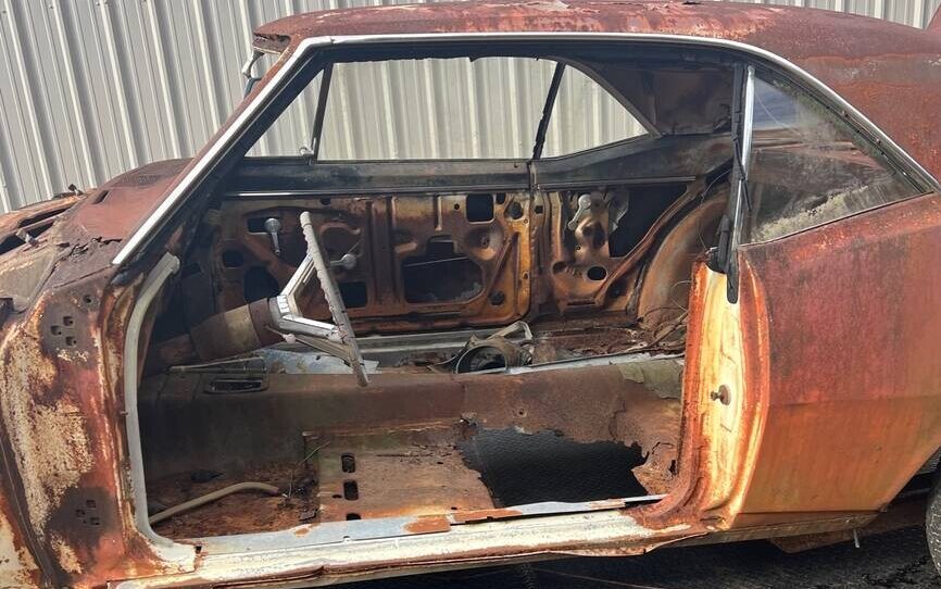 One thing that is identifiable, based on the trim and taillights, is that this Chevy pony car did not possess the Rally Sport (RS) appearance option that was available on all three Camaro models, the Sports Coupe, SS, and the very rare for ’67, Z28. There’s no front clip, windshield, driver’s side door, engine, transmission, or rear window, but there is a ton of rust. There is a rear axle under it, and being a six-cylinder equipped model means a standard ten-bolt differential. There are four wheels making up three different varieties, a Keystone Classic, a ’70s vintage Chevrolet rally wheel, and a pair of what look like a variation on a Cragar S/S. The trim code of “TT” means Capri Cream, both upper and lower (the double paint code is to discern the body from the roof in the case of a convertible, vinyl-covered top, or a two-tone paint job.). What’s left of the trunk lid gasket indicates over spray so it’s indicative of a respray or a repair – not that it matters at this point.
