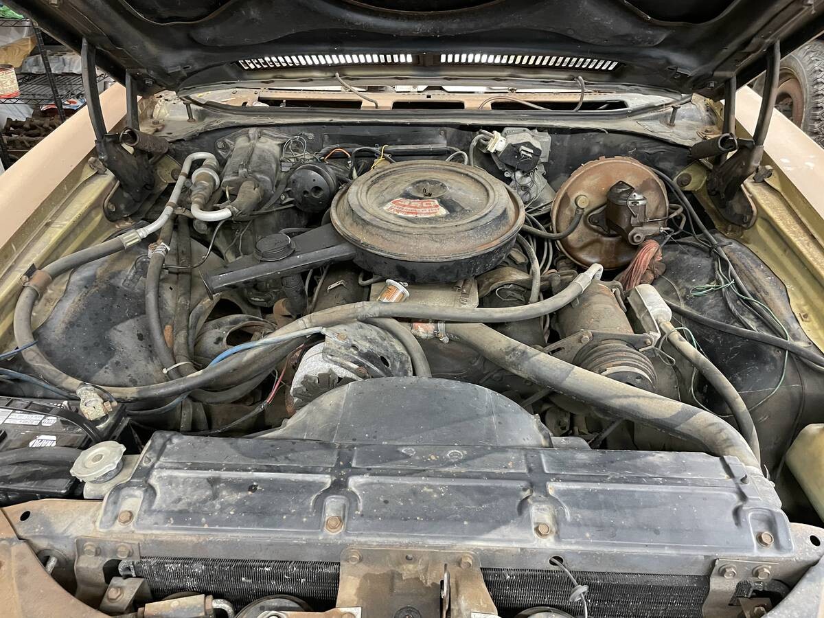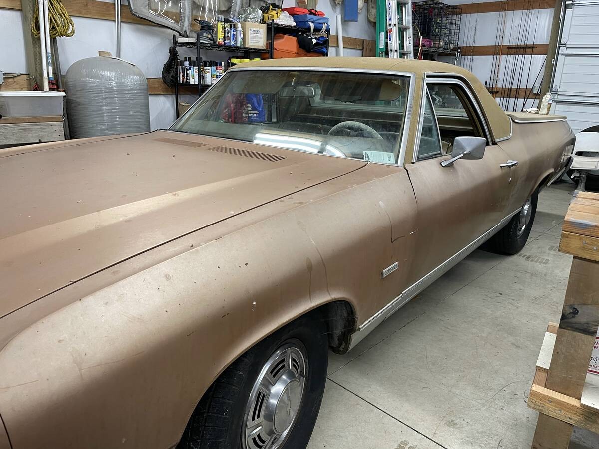 The seller’s ’70 El Camino is mostly original and ready for a cosmetic restoration. The original gold paint is faded, and the matching vinyl top may have seen better days. The body has some dings and scratches, and the seller mentions that some minor rust is present, though the photos don’t show it. Because the bed is covered with a tonneau, we’re told that area of the truck is good, but there are no photos of the cover in the up position. The interior needs attention as well, with some torn upholstery and worn door panels, headliner, and carpeting.