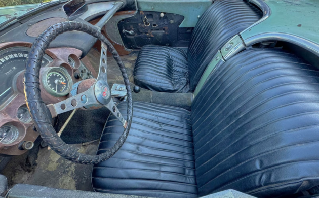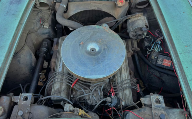 The transmission is a 3-speed manual, so apparently no attempt was made to upgrade to a 4-speed when the engine swap was done in ’63. When the Corvette was assembled, it was finished in black paint, which was switched to a light green sometime back in the day. For patina fans, there is plenty of it, and all of the chrome pieces are pitted and/or rusty. The black convertible top is full of holes, and the black interior has run its course.