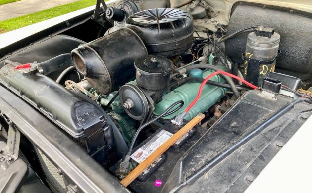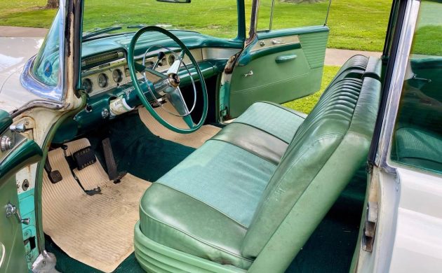 Opening this Buick’s doors reveals an interior trimmed in the Code 453A combination of Green Patterned Nylon and Light Green Cordaveen. As with the exterior, the seller doesn’t mention an interior restoration history. Also consistent with the outside, there are no major flaws or imperfections. The upholstered surfaces look excellent, the carpet is clean, and the abundant bright trim pieces add to the luxurious feel. A trip meter and clock were standard equipment in 1955, with this Riviera also featuring a factory AM radio.