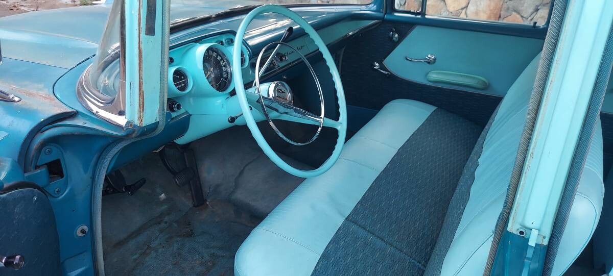General Motors would go on to build more than 4.5 million of the so-called “Tri-Five” Chevies from 1955 to 1957. The third year may be the most collectible due to styling changes that included just the right amount of tailfins (IMO). During ‘57, the most popular series and body style was not the upscale Bel Air, but the midrange 210 which delivered 273,696 4-door sedans for the model year. That includes the seller’s one-owner, Larkspur Blue/Harbor Blue family transport.