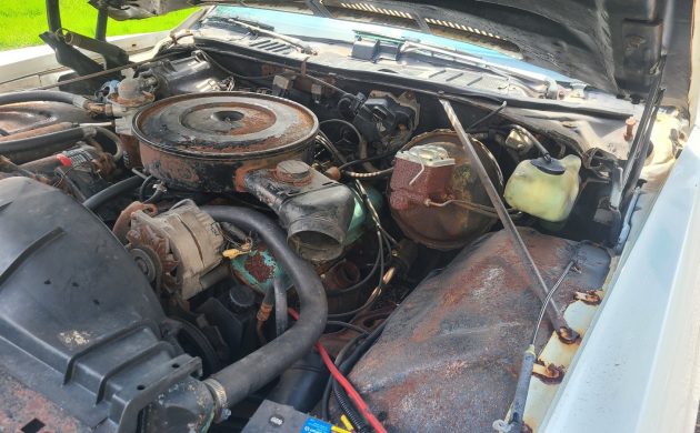 Some of the sheet metal has already been replaced, and we assume that was due to corrosion. Those pieces include the front fenders, hood, and doors. And the rear quarter panels are left for the buyer to address. With these newer body panels, we assume that all or part of the Pontiac’s white paint has been redone. The interior has newer carpeting and one tear in the driver’s side bucket seat that should be attended to.