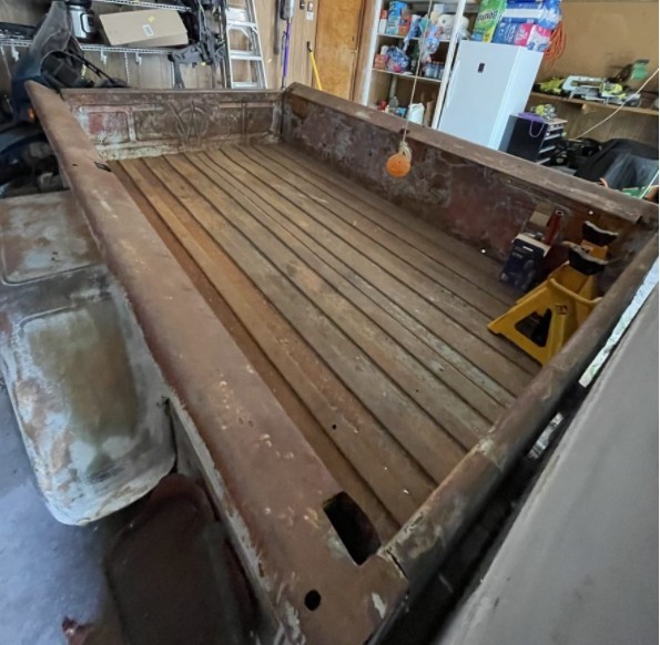The body is good overall and there is green paint to be found under the grey primer. Naturally, it has its share of surface rust after nearly 70 years, and the cab floor has a few small holes along with the bed being thin in a few places. The bumpers are welded on rather than bolted, a step that was taken by the previous owner because they were required in Colorado where the truck lived at that time.