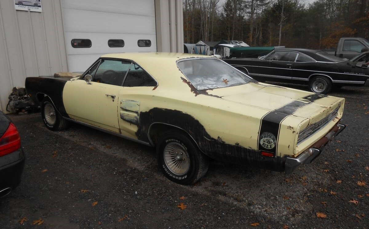 At 94,000 miles, we’re told the Super Bee still wears its original yellow paint, but the cowl tag is so badly rusted that it’s hard to make out any of the numbers. With a lot of black paint in places to serve as a primer, we can’t make out how badly rusted the Dodge really is. But to help rectify some of the corrosion, new trunk pans are coming with the car along with a new gas tank. There’s a driveshaft sitting in the trunk, and we assume it goes to the car. So, this is a rolling project that’s looking for a new home and an owner that has time and a budget to allocate to the auto.