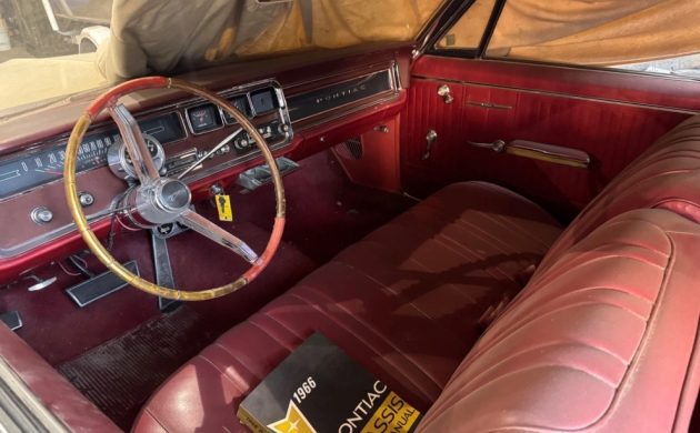 According to the seller, this Pontiac hasn’t moved since 1993. Some of the photos show it in another place and all spiffed up, but we suspect those are “before” pictures from better days. The body and Pearl White paint have held up well, with just one spot trying to catch the rust bug. The red interior looks quite good and may only need detailing.