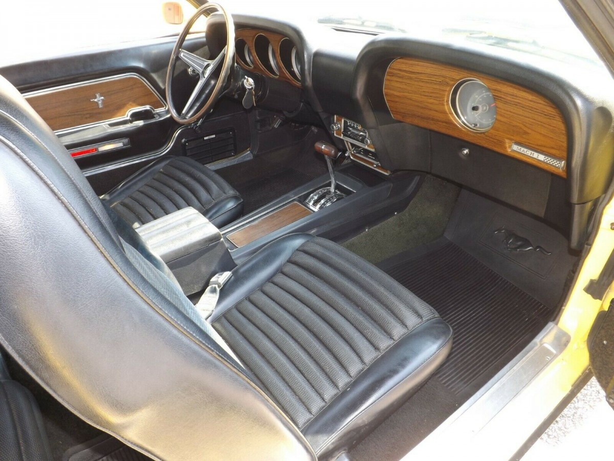 Inside is a lovely, well-kept, deluxe interior. According to the listing, it has rear window defogger, which is said to be an incredibly rare option. Being that the car is from Ohio that would probably be a very helpful feature. The black leather complements the exterior yellow paint nicely. This is the combination I think of in my head when I hear of a Mach 1. Probably because I have a Hot Wheel that looks similar.