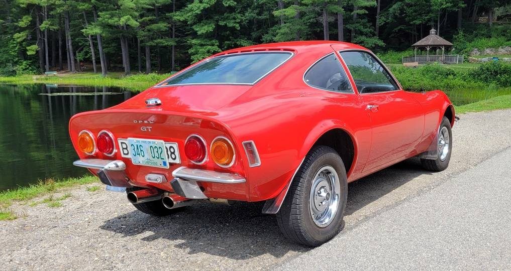 Even though it qualifies for AARP, this GT doesn’t look 50 years old inside or outside. It’s Flame Red paint is shiny and I can’t spot any major issues with the car’s exterior. (I’m not sure if the current owner added the splash guards or not.) Rust can be a big enemy of these Opel GT’s and none can be seen in the photos. The seller states that it is a solid original car with no rust and that it has been kept stock, including the AM/FM radio. It was repainted in 1997 and photos are provided. Most Opel GT’s came with black interiors and this one looks exceptional and inviting. The seats, dash, and 4-speed shifter all look very good. Based on several Opel GT Buying Guide sites I found online, cracks in dashboards and steering wheels are common. The dash looks fine and the seller states that the original style steering wheel was replaced in 2018. New black carpet was added in 2014.