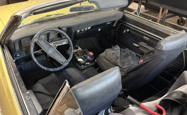 The seller claims he’s handling the sale for the owner, who has possessed this car since 1972. Originality abounds, though, as stated earlier, a single repaint has occurred. The seller adds, “Surface rust underneath. No rust through on floor pans. No rust in trunk, no rust in rockers or quarters, or fenders. Very clean car.” The exterior does show well, though the rear bumper is displaying some rust bleed-through. No comment is made regarding the folding top, but it looks pretty good despite its clouded rear plastic window. Good news! All four “cocktail shakers”, which balance components of first-generation F-body convertibles, are still in place – they often go missing.