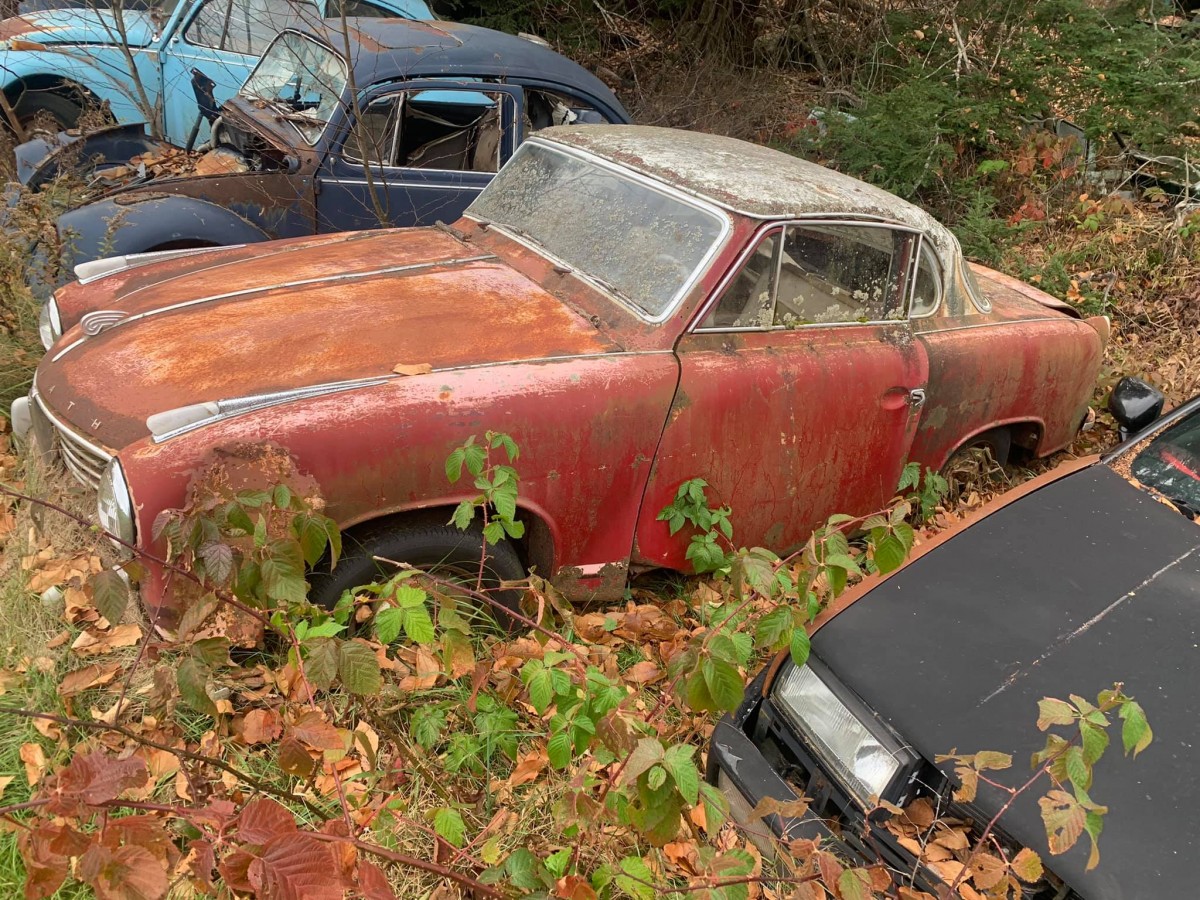 A Lost Place junkyard. Make some photos before crush it. The Borgward Isabella is a 2 door limousine, So it isn`t worth to save it, but some parts from it would be. The Goliath (or Hansa, doesn`t matter) is a coupe and not the 2 door limousine (complete stupid, I know). So it`s quite rare and perhaps somebody in the world will make with a restorable limousine and this car one rare car. Some of the other cars on Facebook are intressting partcars. Studebaker Hawk, Covair and some of the older stuff. But what is this strange station wagon on Facebook? Is it an Rampler Cross Country Wagon? Is it worth to save it?