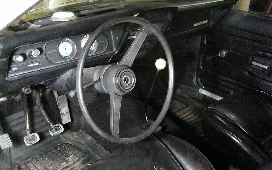 The interior is a black vinyl arrangement featuring bucket seats, sans center console, divided by a Hurst four-speed manual shifter. The images aren’t very conclusive as the interior is very dark. It’s almost out of view but the driver’s seat appears to have some degradation. Beyond that, it looks complete and in fair shape.