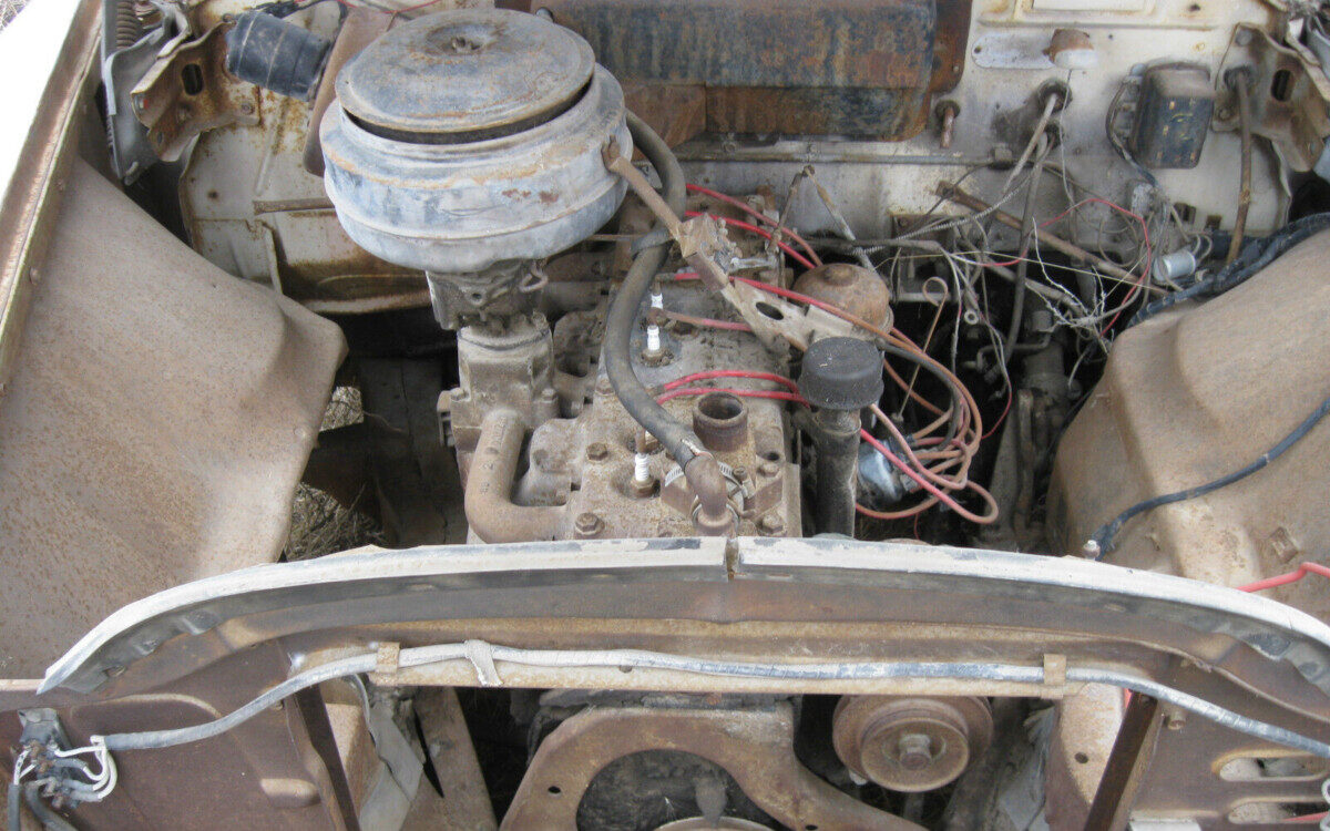 This 1953 Chrysler is Hemi-less, being powered, when running, by a 119 HP, 264 CI, flathead, in-line six-cylinder engine – doesn’t sound very Chrysler-like, but that’s the way the Windsor rolled in ’53. It’s obviously missing parts and the seller suggests that it’s “stuck“. Too bad, but it’s a pitchable engine anyway. A three-speed manual transmission handles the real wheel connection.