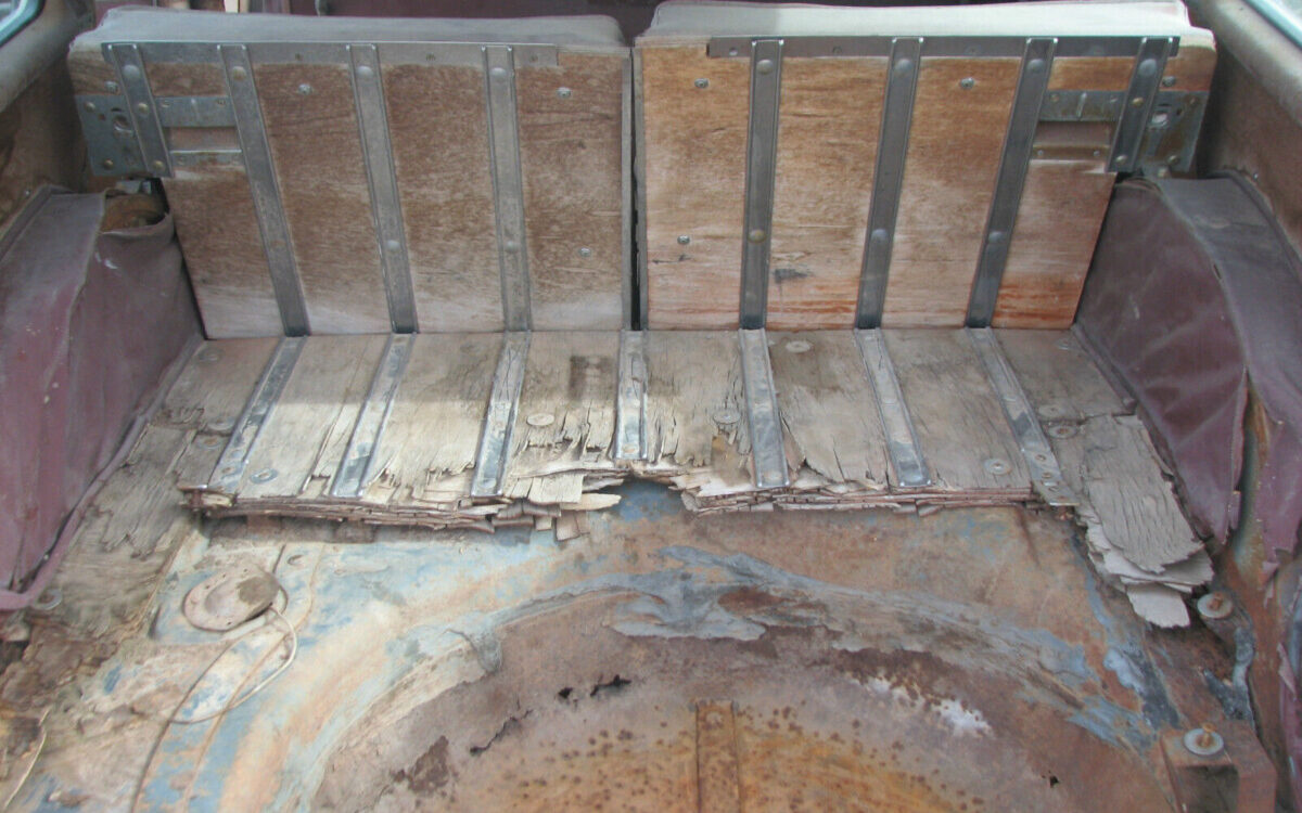 Scarce is a good description for this wagon as it’s one of only 1,200 produced in ’52. Throw in the New Yorker version of the Town and Country and you up the wagon number by only another 1,400 units. And today, 70 years on…yeah, it’s a scarce one. Specifically, this car is considered very complete minus its Town & Country badges. But that’s not exactly the case as there are other missing things like the taillights and rear trim. And speaking of the trim, what’s there is pretty forlorn – the chrome-plated bumpers, however, aren’t too bad. Yes, it has surface rust and some isolated rust through here and there. Dents? Yup, those too. The seller suggests, “This car can certainly be restored or it might make a wonderful parts car if you are restoring a rusty car like this“. Parts car? I dunno about that, this one seems better than being reduced to that ignominious fate.