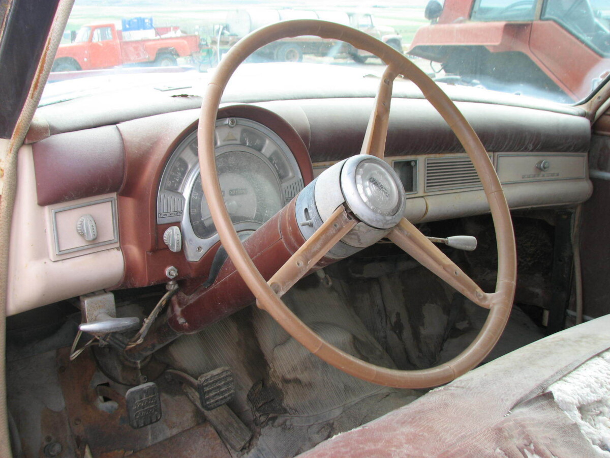 The interior is rough! The driver’s side floor is wearing some pretty sizeable holes and the upholstery has gone up in fluff. Unfortunately, the genuine wood cargo floor looks as if it has become termite fodder – too bad as the combination of the wooden components and the stainless trim was probably very impressive looking in the years that have gone by. The spare tire well, under the cargo floor, is probably going to need some metalwork. Unusual for the era, with a premium car anyway, is the austerity of the instrument panel. It looks like 1953 but not what I would expect in a Chrysler – it’s more like a Plymouth outfit.