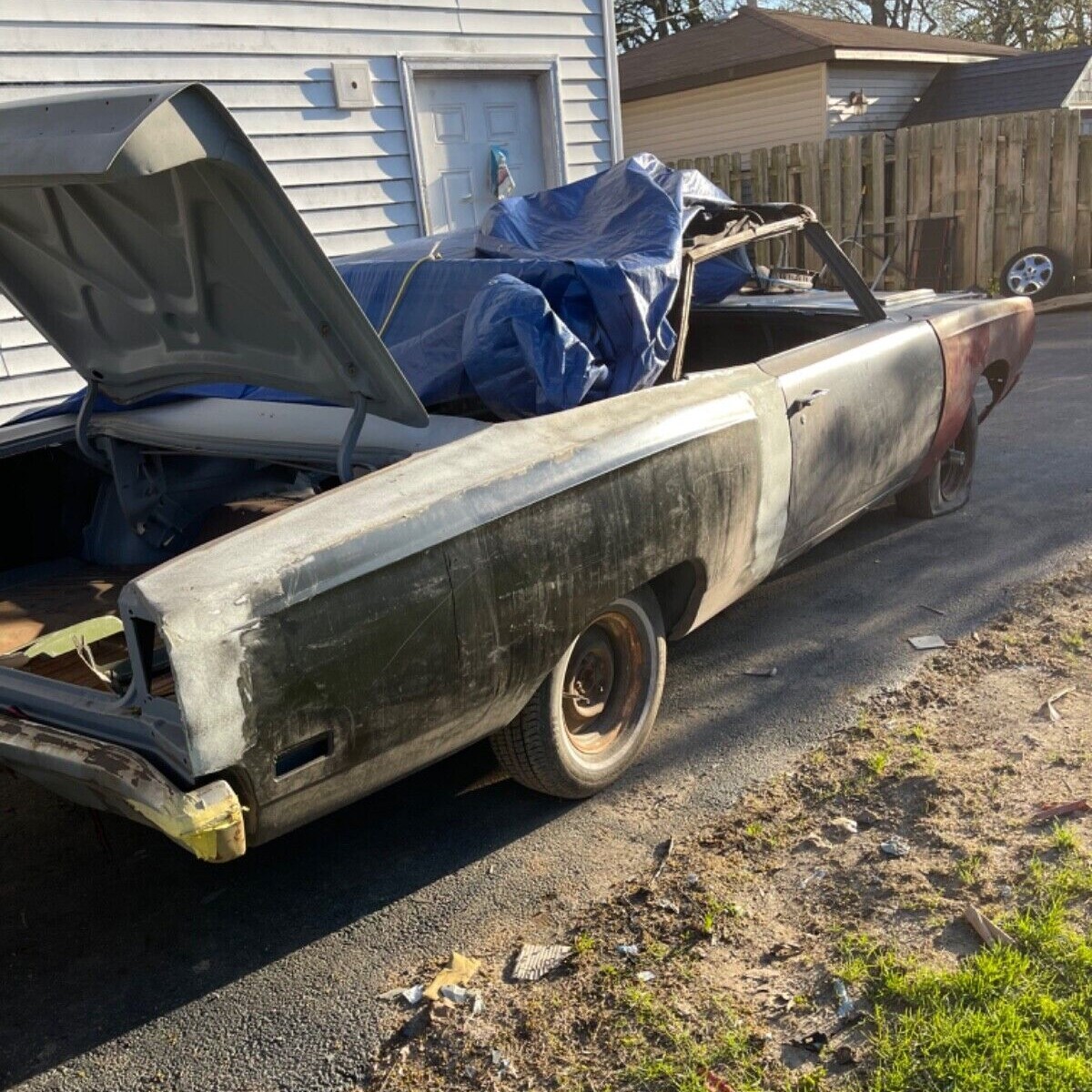 We’re told there is a lot here that is not rust-free, such as the floors, trunk, frame rails, cross member, doors, deck lid, and more. Front bucket seats, a rear bench seat, and door panels will go with the car, but their condition isn’t known. And we don’t see much in the way of glass. There’s a lot to be done with this car and it won’t be numbers-matching when you get done. But you’d likely have one of the few Road Runner drop-tops that haven’t gone on to the automotive graveyard.