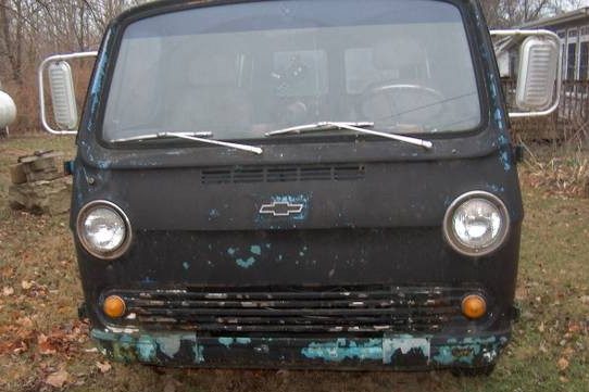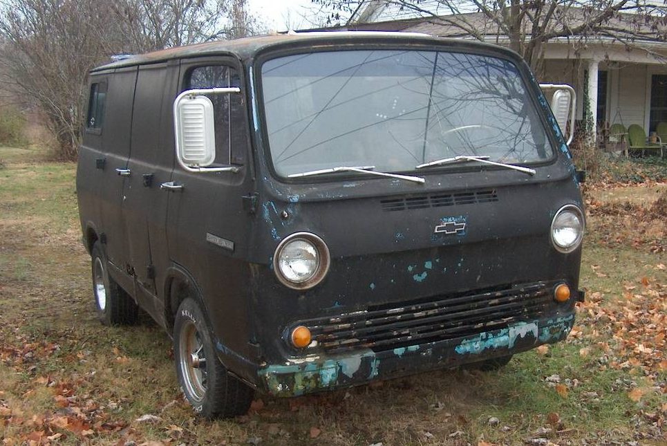 Apparently, this is a 1966 Chevrolet sports van and the engines available were the base engine as Bob C. pointed out 153 cu in ( 2.5 L) 4 cylinder or a 194 cu in ( 3.2L) 6 or a 230 cu in ( 3.8 L ) 6. were available. They were manufactured in Pontiac, Michigan. I personally love the look of these first generation vans and a full custom interior, new paint job and remove that godforsaken makeshift rear bumper would make this a nice show Van. Simplicity in nature but cool as all get out. The lack of many windows does it for me.
