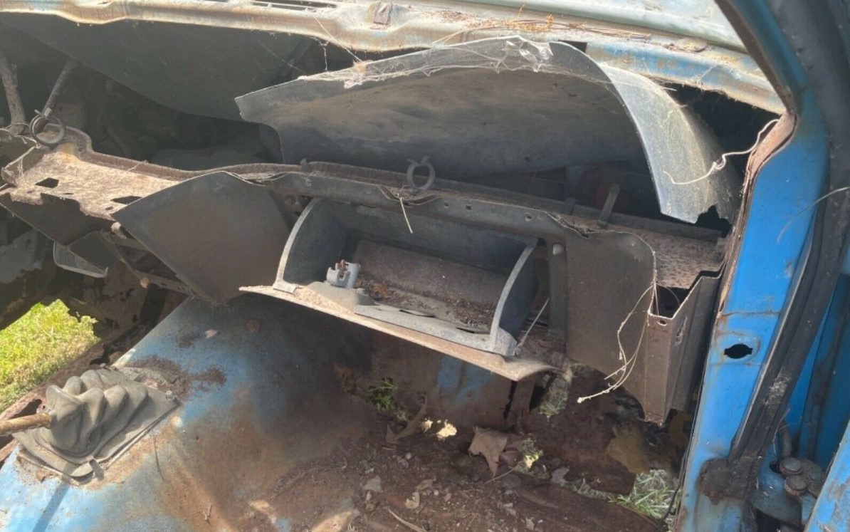 Inside is worse than the outside! The floors are rusted through, the dash and instrument panel are gone though the gauge bezel may be included in the parts pile. There are no seats or door cards, no nothing really. It’s more of a no canvas than a blank canvas.