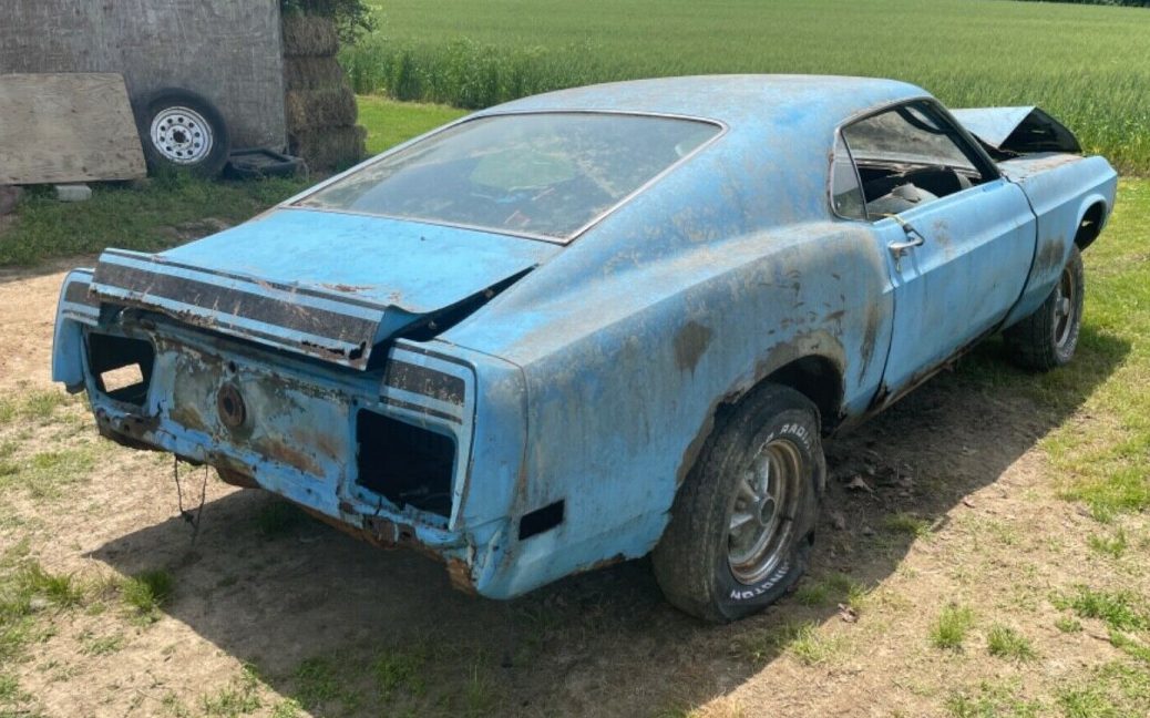 There is a pile of parts that are included in the sale but the focus needs to be more on the structure and integrity of the unibody – what’s here does not present well. It’s definitely a Grabber Blue Mach I but rust, dents, and bent sheet metal abound. Other items like bumpers, headlights, taillights, and grilles are missing though some may be ensconced in the previously referenced pile-o-parts. Troubling, is the assertion, “has a lot of good parts but rust in frame rail an some in torque box“. Yes, rust-through is seriously plaguing this Mustang. The structure, trunk, and floor rust are considerably worse than that in the exterior body panels, though those panels are hardly free of the dreaded tin worm. It would appear as if this Mach I was parked outside for a lengthy period, windows down, maybe trunk ajar, and thus the rust pit that exists today. The wheels are a bit hard to discern, besides the obvious corrosion, they look like a cross between an American Racing Torque-Thrust and a Cragar S/S.