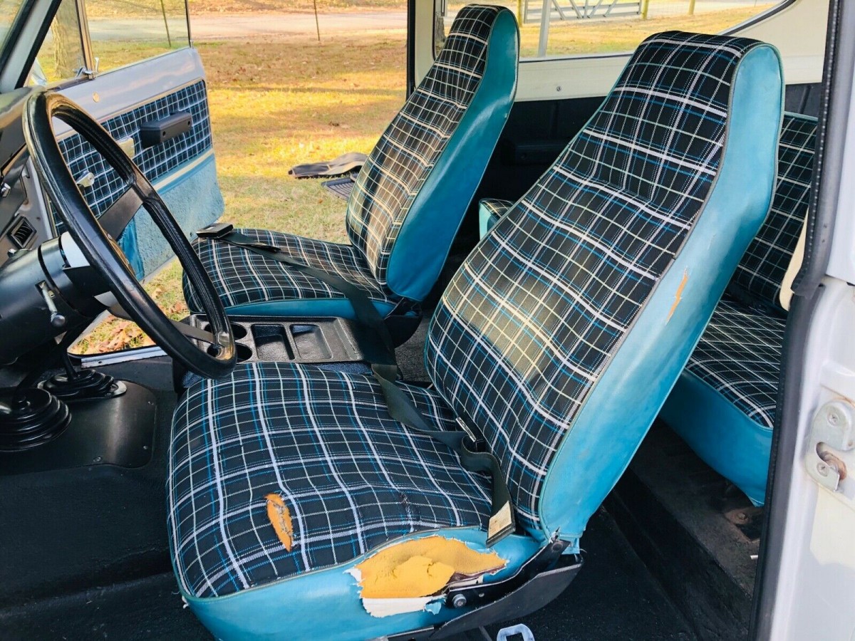 The interior is certainly eye-catching and is surprisingly vivid considering the staid exterior. The driver’s seat will need some work, but you could also live with this for the time being with the help of a seat cover. The truck is all original inside, and the dash retains its original paint. The good news is the original fabric is still available, according to the seller, and he recommends re-doing the front seats but leaving the back seat alone. The Scout is equipped with air conditioning but it doesn’t work; other non-functional interior components include the clock, radio, and fuel gauge. Overall, for an unrestored cabin, this one is holding up pretty well. The transmission is the preferred manual gearbox with a Dana 300 transfer case.