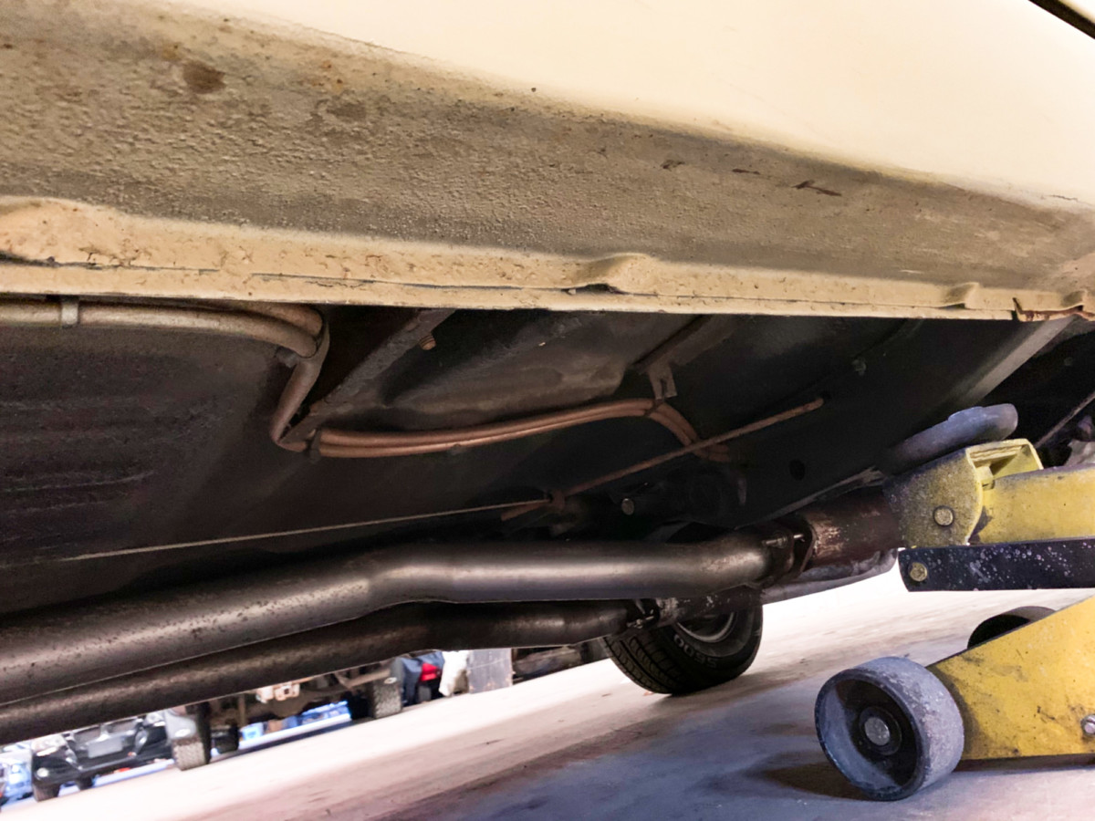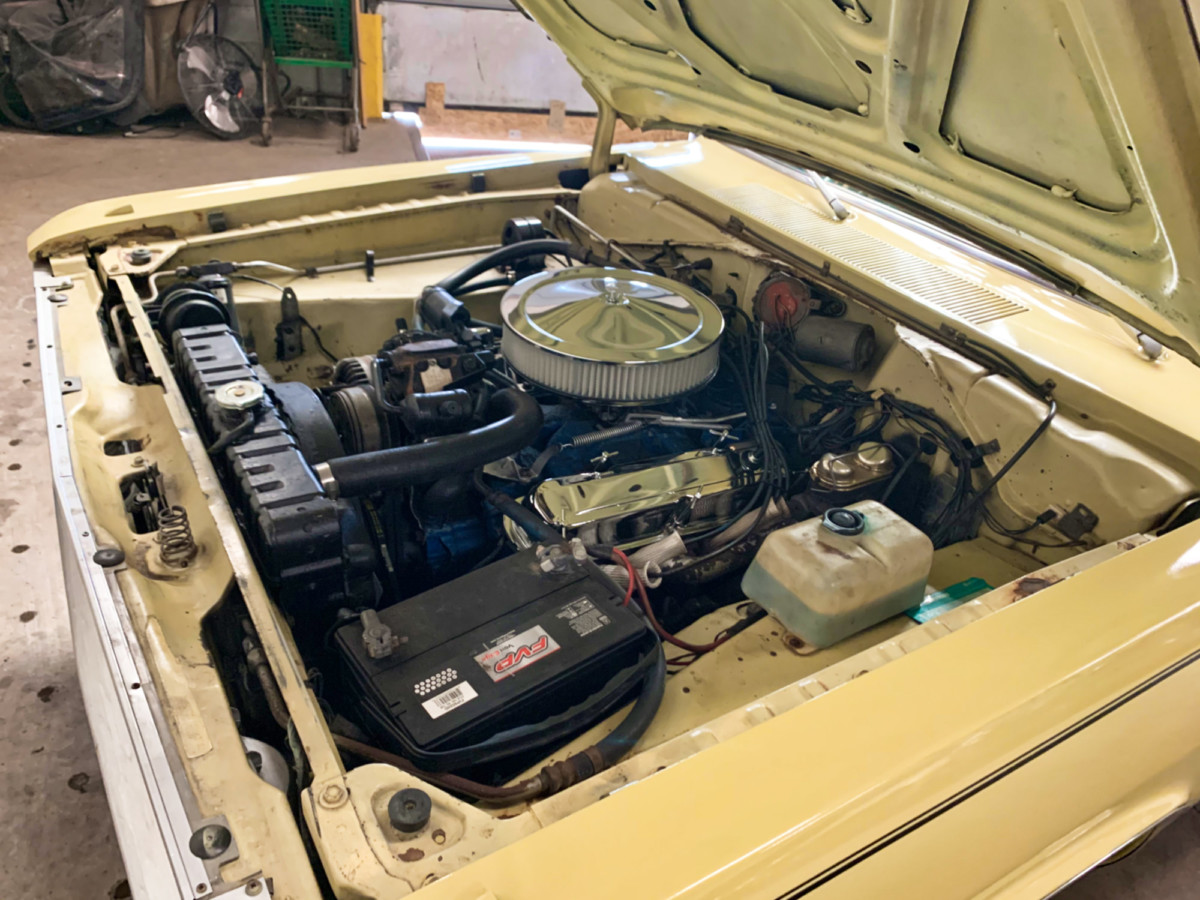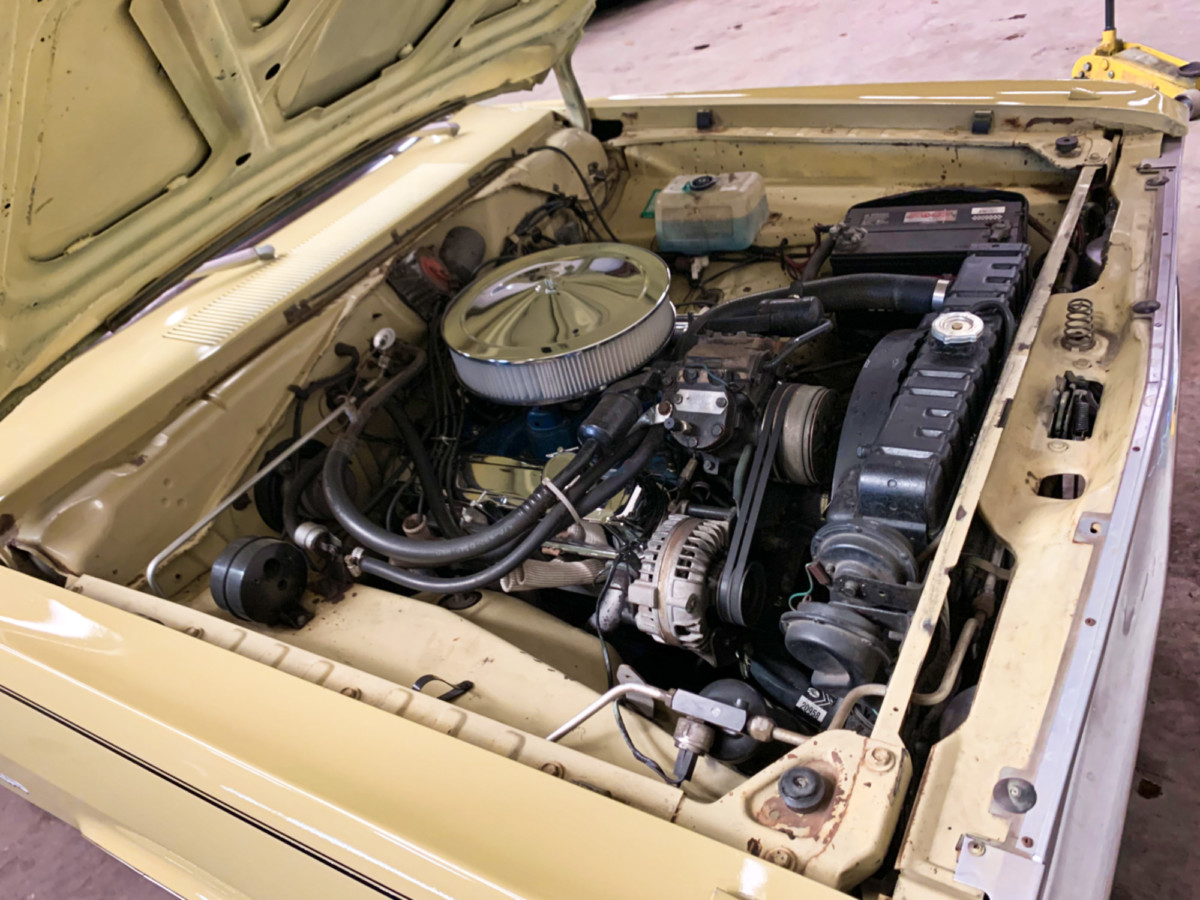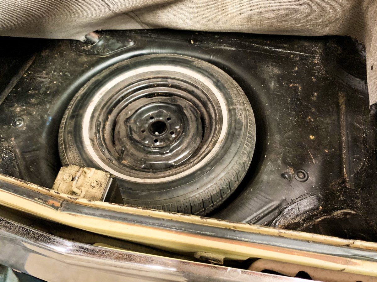 Interior is mismatched – black seats and door panels, tan dash, carpets and headliner – but not in an unacceptable way, especially since some sort of period cloth seat covers would be in order to make what would be a summer car more comfortable than the black vinyl is.