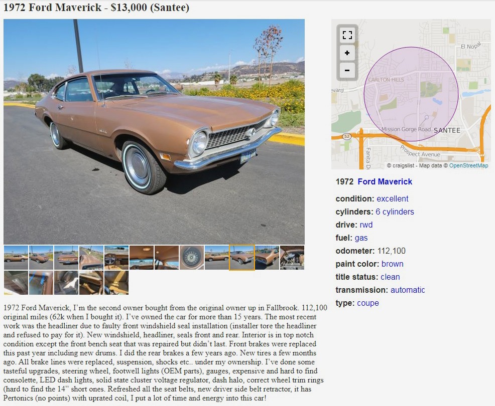 Somehow, 53 years have trickled by, and I’m not sure how that happened. I seem to remember 1972 as if it were just yesterday. Well, maybe not that vividly, but I certainly remember parts of it. This 1972 Ford Maverick is 53 years old now and has had just two owners. The second owner has it posted here on craigslist in Santee, California, and they’re asking $13,000. Here is the original listing, and thanks to Barney for the tip!