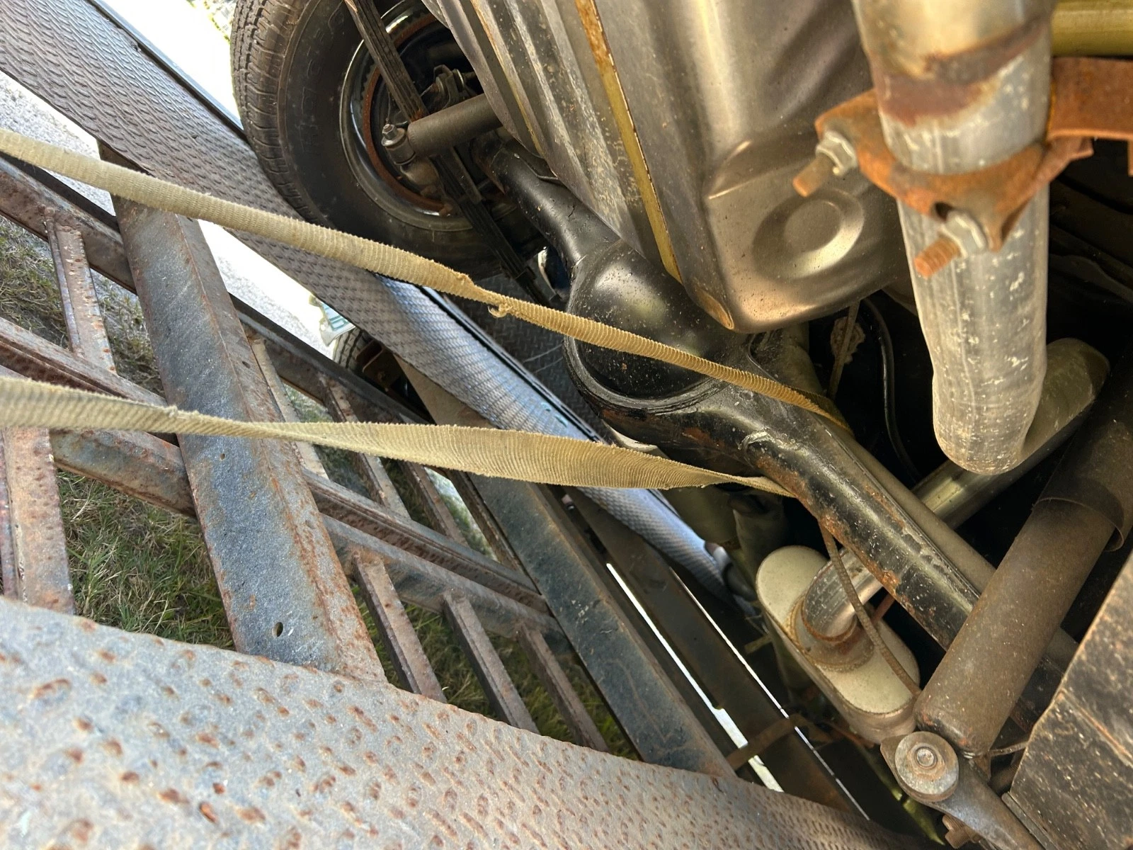 An apex muscle car hard hit in the front. No pictures detailing what is obviously massive damage to the front/right front. Random pictures of other areas of the car. ID tag lying on a piece of OSB. Photo edited with MS Paint to obscure information on the ID tag. The engine has had the exhaust manifold(s?) and the water pump removed for some reason; that nasty air filter seems inconsistent with a carefully restored high end car that got sidelined suddenly by a collision. Rusty, crusty structure visible in the engine picture. Hoses missing; valve cover off; random hardware lying here and there and a long bolt sticking out of the intake. Oil pan damaged? Perhaps when the engine was sitting, along with the other hero parts stripped from the original wreck, in somebody’s shed for half a decade waiting on the right buyer. Replacement body parts tacked on to make it look like a whole car again. Still on the trailer and secured by a single (frayed) ratchet strap looped around the axle tube. ‘call call for additional info’ — much harder for some unfortunate purchaser’s attorney to prove misrepresentation when all the BS is via the phone and not printed. Might be interesting to learn where and when and how the ostensible VIN ended its last registration. This thing sure feels like a hodgepodge of abandoned, auctioned, Craigslist and/or ‘involuntarily misplaced’ parts stuck together to resemble a ‘restoration project.’