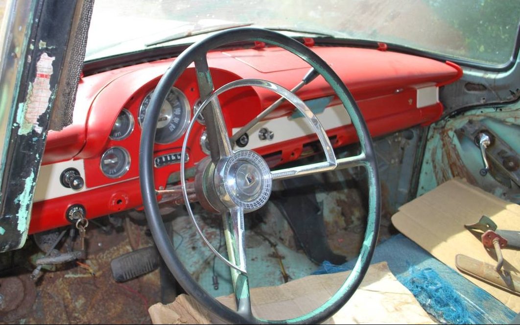 Based on the door jambs, the hospital ward seafoam green would appear to be this Parklane’s original upper shade. If that’s the case, what’s up with the red dashboard? These were all steel and could be pretty easily repainted, but why red? (It’s a rhetorical question).