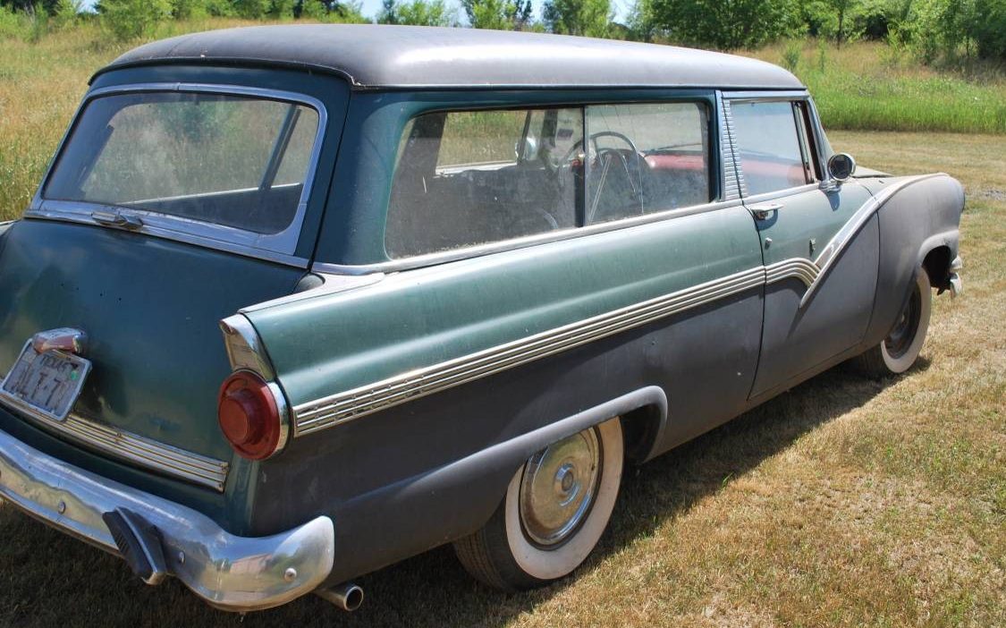 The taillights are 1956. The inner trim piece has either fallen off of the plating in the plastic trim ring has deteriorated. ’55 taillight lens were round, like the ’56, but had different contours. This car did originally have a V-8, most likely the 292. If you look closely at the right-front photo you can see the 3 small (app. 1/8-inch) holes wear the Thunderbird V8 badges were affixed. I know these cars pretty well– there’s a ’56 Ford Custom Ranch Wagon (my high school car) sitting in my garage, waiting to be resurrected.