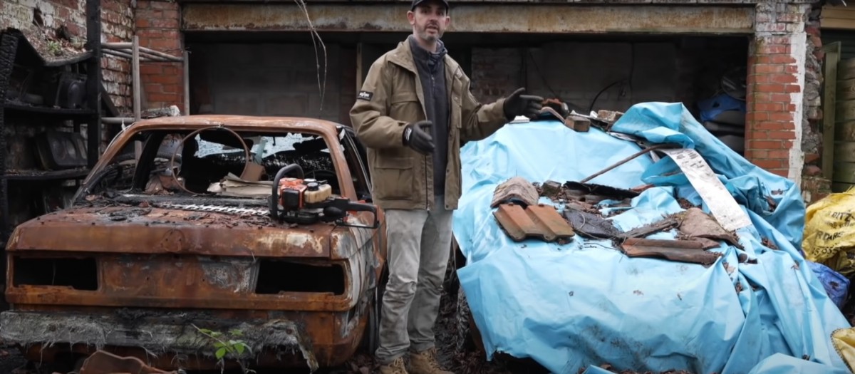 The host walks us past two cars that were unfortunately caught in a garage fire, and the structure itself has largely disappeared behind him. The BMW 3-Series on the left is an E30-chassis car with the M42 four-cylinder engine; not the most sporting of the drivetrains offered but fairly durable. Under the cover is a Porsche 924 Turbo, which was apparently also singed by fire but not entirely destroyed. It is unlikely the E30 will return to the road, as from the cabin back is pretty much scorched. Surprisingly, the engine bay remains largely unaffected by the chaos that unfolded back by the rear of the car. The 924 may be restorable; the 3-Series definitely is not.