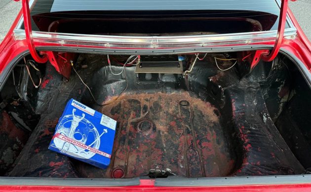 That plaid upholstery takes me back, the pattern looks like a pair of pants that I used to wear when I played golf…The interior is a mixed bag. It initially shows well but further inspection reveals a cracked dash pad, missing headliner and rear package shelf. The instrument panel with its federal 85 MPH speedometer is clear and legible, however, and the carpet has been replaced.