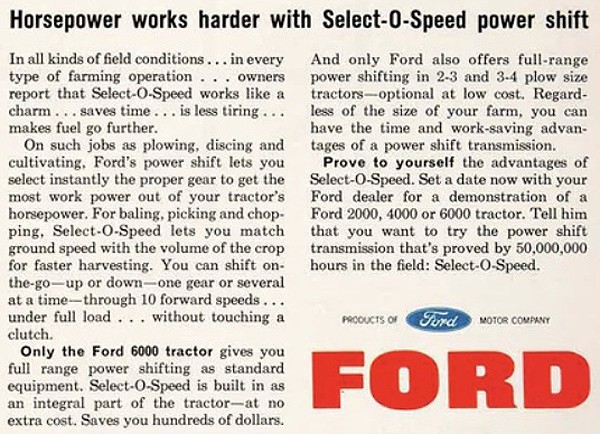 Ah, Error 403 Forbidden, my arch nemesis. Obviously nerve wracking for all, here’s a(nother) condensed version. My brother lives in the country, and always had hobby tractors. His 1st and 2nd were H model Harvestors, late 40s, then got a ’53 Ford 800 series, that I thought was newer, and more like this. I’ve been around farm tractors from my mid 20s on. I hung out at several friends parents farms, and had to get to know how to operate them. My favorite is the A-C D17. The worst? A Leyland, sorry mates, a very poor tractor. The Select-O-Speed, I read, was a novel transmission. 10 forward speeds, 2 reverse, and somehow hydraulically shifted on the fly, but no torque converter, and a regular dry clutch that had to be depressed when stopping. I bet many bought these as they outgrew the postwar 8N, but kept it because it still ran good. Live PTO, much better and safer.