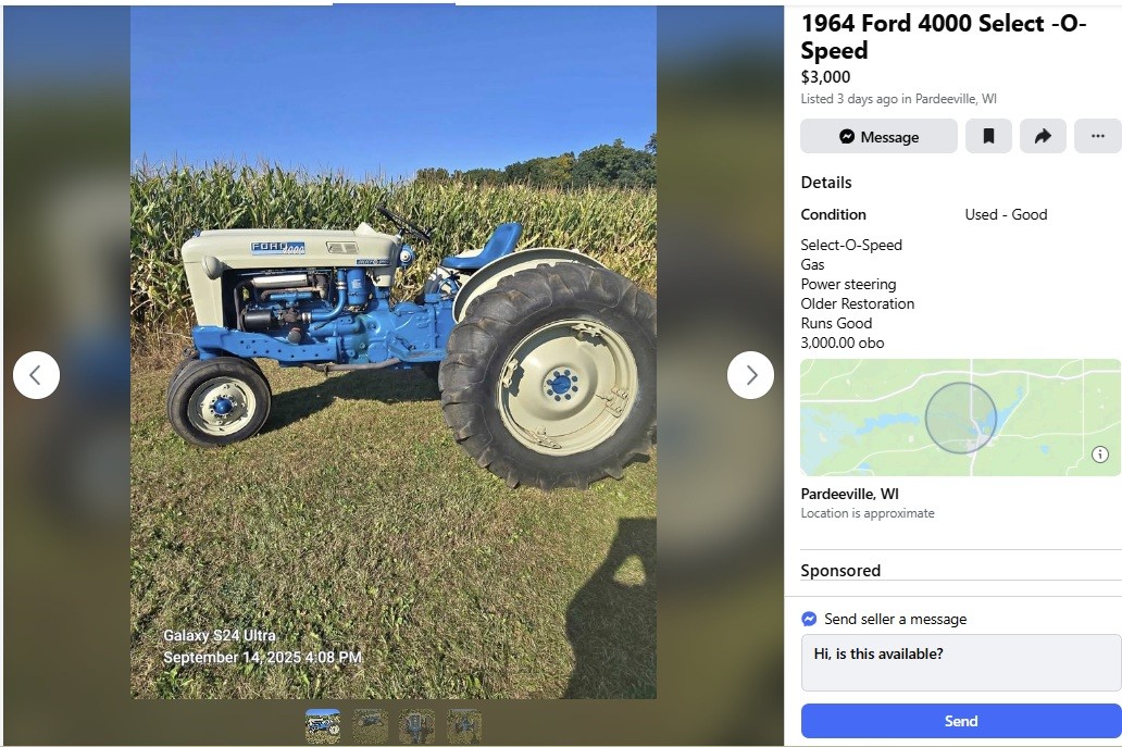 This particular tractor may be fine, but the Select-O-Speed doesn’t have a good reputation … something to be mindful of if you’re interested and are not familiar with this generation of Ford tractors. (I’ve owned a 1950 8N for almost 25 years, and farmed with it for about 15 before we retired and downsized).