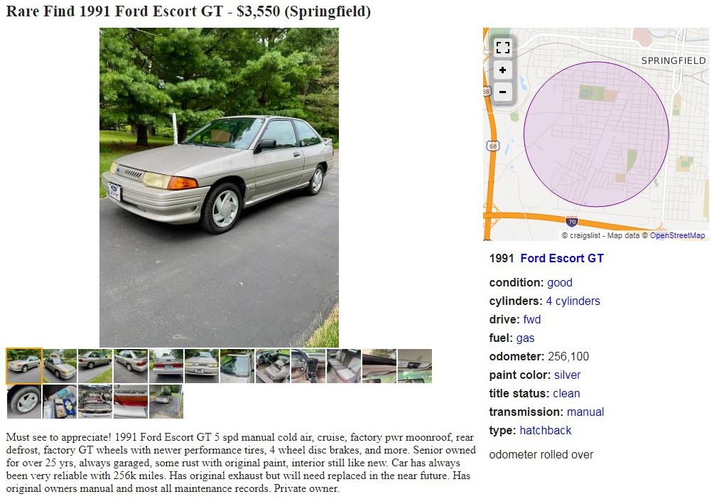 As usual, I’m hoping the Ford paint scholars in the crowd can nail down this color. Alabaster? Light Titanium? I just like to fill in the blanks whenever I can. Whatever color it is, we haven’t seen too many 1991 Ford Escort GTs here on Barn Finds. In fact, we’ve only seen one. Here’s another, and it’s posted here on craigslist in Springfield, Ohio, and the seller is asking $3,550. Here is the original listing, and thanks to Rocco B. for the tip!