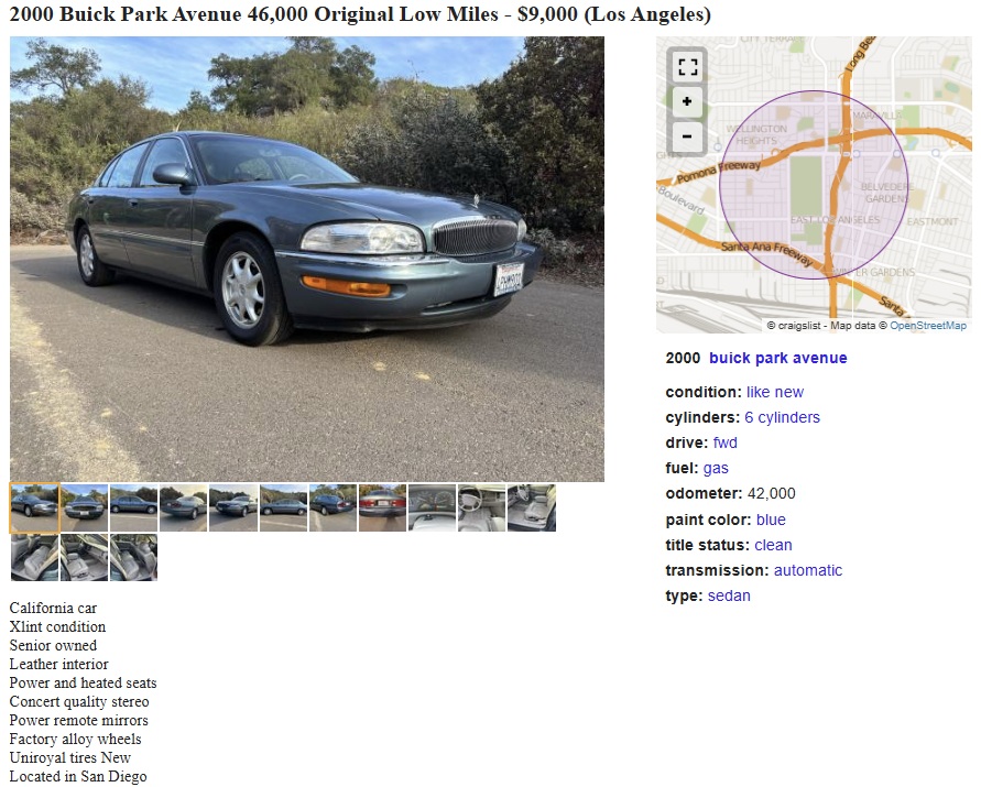 Originally available as basically a fancy trim package on Buick’s rear-drive Electra Limited models in the mid-1970s, the Park Avenue became its own model, moved upscale, and the drive wheels moved up to the front of the car by the mid-1980s. The seller has this 2000 Buick Park Avenue posted here on craigslist in San Diego, California, and they’re asking $9.000. Here is the original listing, and thanks to Jack M. for the tip!