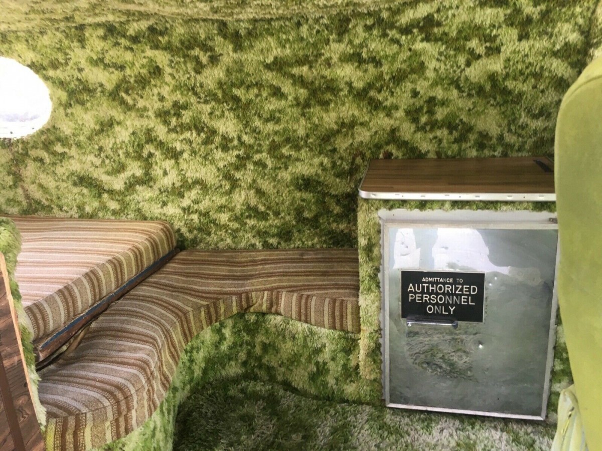 Sure, up close, I’ll be this interior is a little too funky to reside in right now, but it doesn’t look like you need a HAZMAT suit to enter, either. I’m assuming the authorized personnel specified on the ice box is anyone who wants a cold beer, but it’s good to ward off any moochers when possible. The rear platform appears to be a sleeping area, and there’s an additional cabinet to the bottom left of this photo.