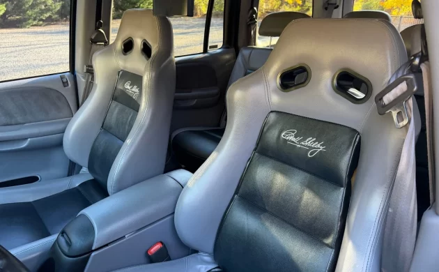 On the inside, driver and front passenger got these terrific Cerullo bucket seats, and the rest of the interior corresponded nicely with gray leather and black inserts. Shelby’s signature was seen on the bucket seats and the dashboard, with the latter adorned with carbon fiber trim. The exterior obviously sports a custom body kit with giant driving lamps up front, and those slick polished “twist”-style wheels are entirely period-correct. The most significant change from the Shelby recipe made by a previous owner, however, is the suspension: they smartly installed Edelbrock IAS shocks and presumably some lowering springs to kill the ridiculous fender gap these trucks originally came with.