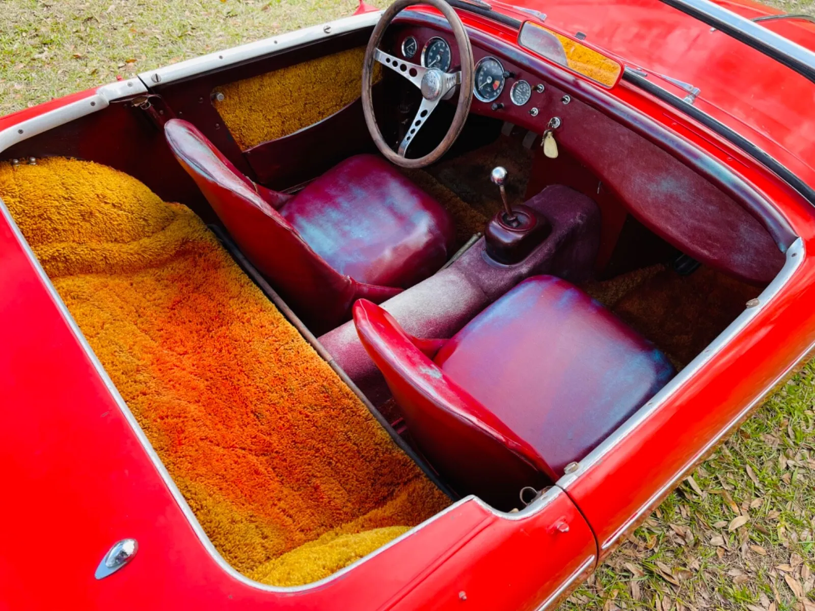 There isn’t much more on the car, but there are 171 photos that tell a pretty good story. The paint is shiny but with scratches, nicks, gouges, etc. There isn’t much chrome on these cars (virtually identical to the Mark II Austin-Healey Sprite of the period) but what’s there looks pretty good. The seats are discolored but not torn. That shag carpeting on the floor and the parcel shelf is not original. The front grille has crushed bars.