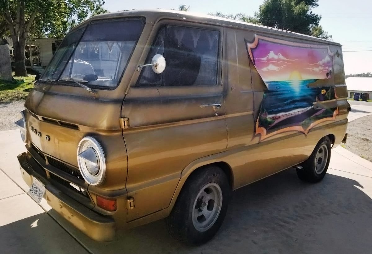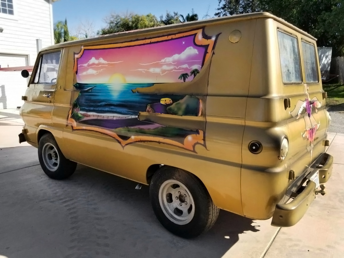 This the van that started it all. ( aside from the VW bus) Miserable vehicles to drive, a friend had one. At least all the fluff will reduce the rattle can effect some. You can’t see it, but the top of the engine cover opens, and oil and coolant can be checked, but ANY maintenance, requires cover removal, and it’s a pain. The Tradesman was a much better unit, and after it came out, these dropped off pretty fast. No thanks on the A100.