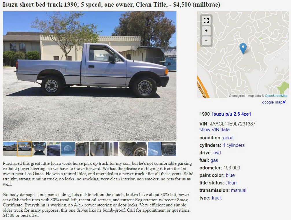 Looking like a great little truck that just didn’t work out for the seller’s son, who wasn’t comfortable parking it without power steering, this 1990 Isuzu Pickup is a short bed model with a 5-speed manual transmission and is said to be solid. They have it posted here on craigslist in Millbrae, California, and they’re asking $4,500 or best offer. Here is the original listing, and thanks to Barney for the tip!