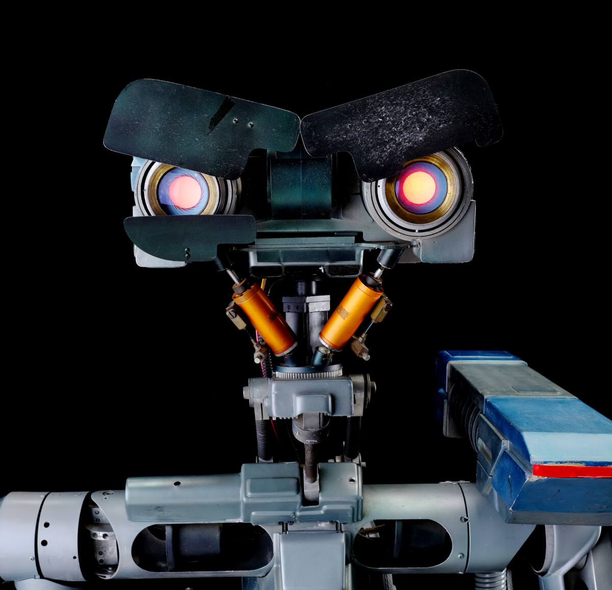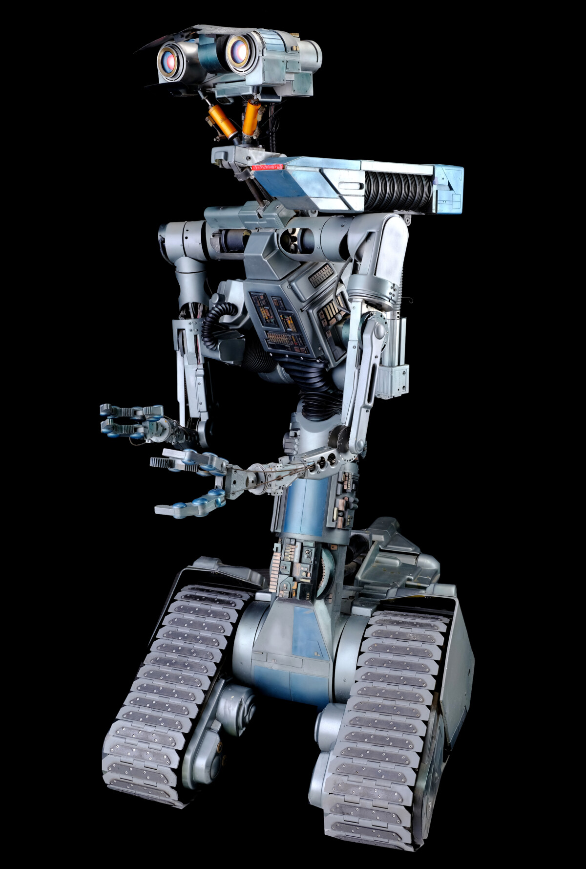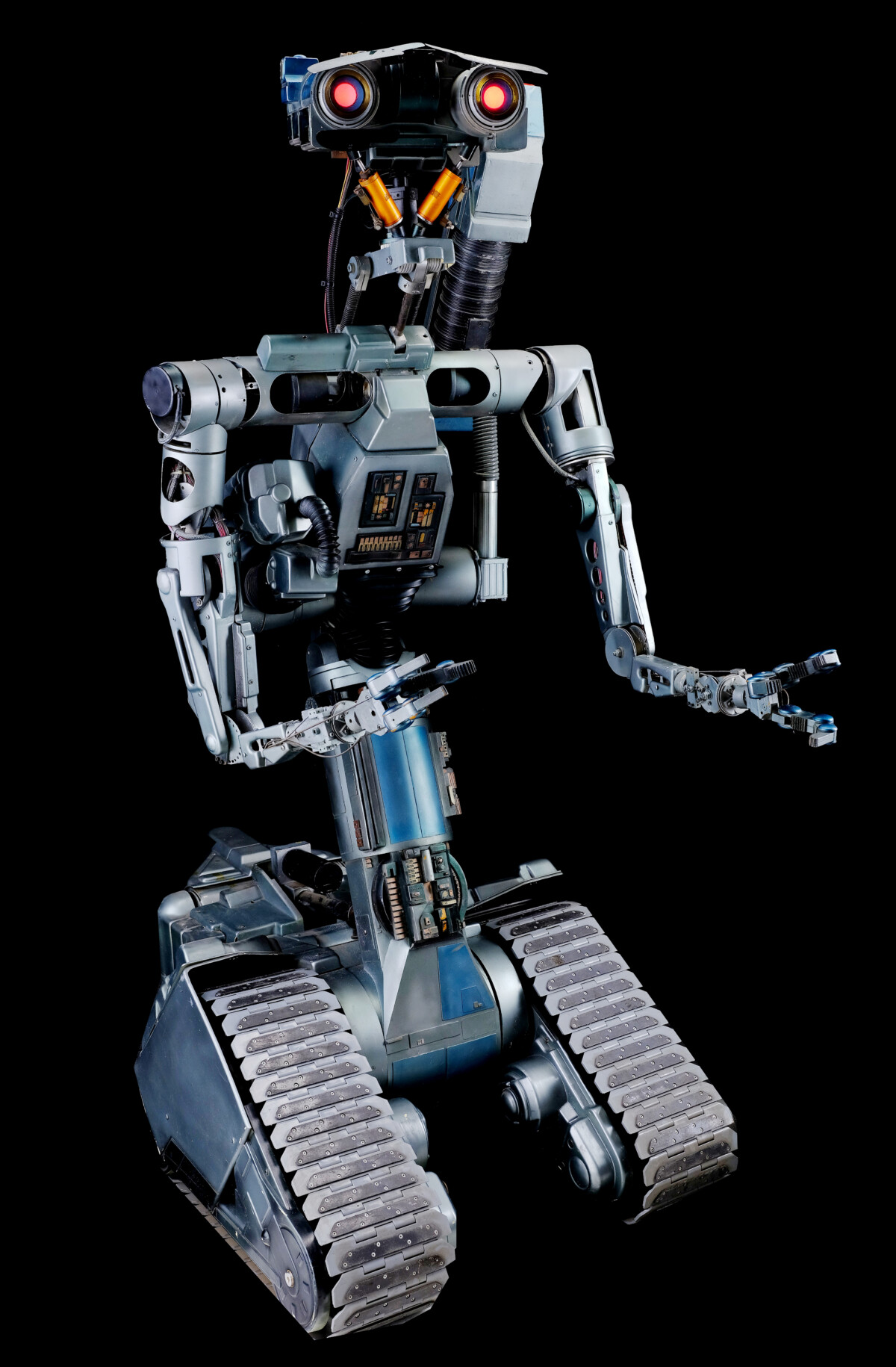 The robot offered in this auction is one of several produced for the movie, each serving a different purpose. The studio used our feature Johnny 5 for closeups of his face and eyes. Therefore, items like his tractor treads are not functional. That makes him a stationary exhibit, but his eyes still illuminate red as they did in the movie. His body is mainly plastic, featuring “decorative” items like wires, relays, fuses, cables, and chains. Mounted to his left shoulder is his primary weapon, a non-functioning laser. He was used during the original Short Circuit production before the studio placed him in storage. The studio reused some of the original robots during the sequel, but not this one. Apart from minor restoration on his head, he remains as he was following the end of filming. He has marks and scratches but is complete.