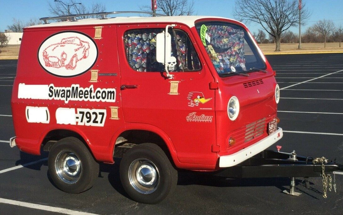 When it comes to using vehicles as promotional items for a business venture, it’s hard to go wrong with vans cut down to clown-car size. This van goes one step further in the promotional category, as it’s technically a trailer that can be pulled around to different swap meets and other ventures where such a crazy custom might draw a crowd. This chopped trailer is based on a 1965 Chevrolet Handi-Van, and as you can see, it’s a shadow of its former self. Unlike the shrunken VW Buses and other period vans that actually still run and drive (poorly), this custom “hippy van” here on eBay is all-trailer with a small living space inside. Bidding is at $1,925 with the reserve unmet.
