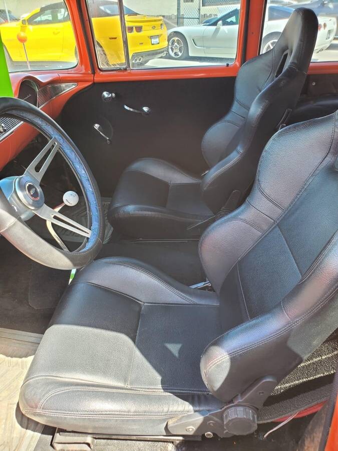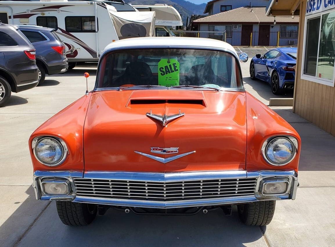 Since the doors are not wide, that lends credence to this having started out as a 4-door wagon. It could be one of the nearly 15,000 Townsmen that Chevy built in 1956. This one sports a 350 cubic inch V8 rather than the 265 V8 or 235 inline-6 it would have left the factory with. A 4-speed manual transmission joins the mix, as does front-end work done by Jim Meyer Racing out of Lincoln City, Oregon. But what did this work entail?