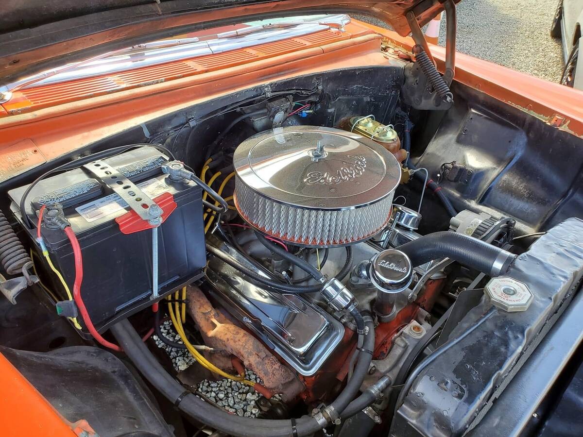 This Chevy has recently received some variation of a tune-up and new valve cover gaskets. It’s missing the front bumper which may be on purpose. Since the seller says it’s a fun car to drive around town, we must assume the car’s mechanical health is not where the TLC is needed. The white and orange paint look good enough, though they don’t merge well in the door jambs. Is this custom wagon one you’d go after, or would you instead apply the money as a down payment on a 1956 Nomad?