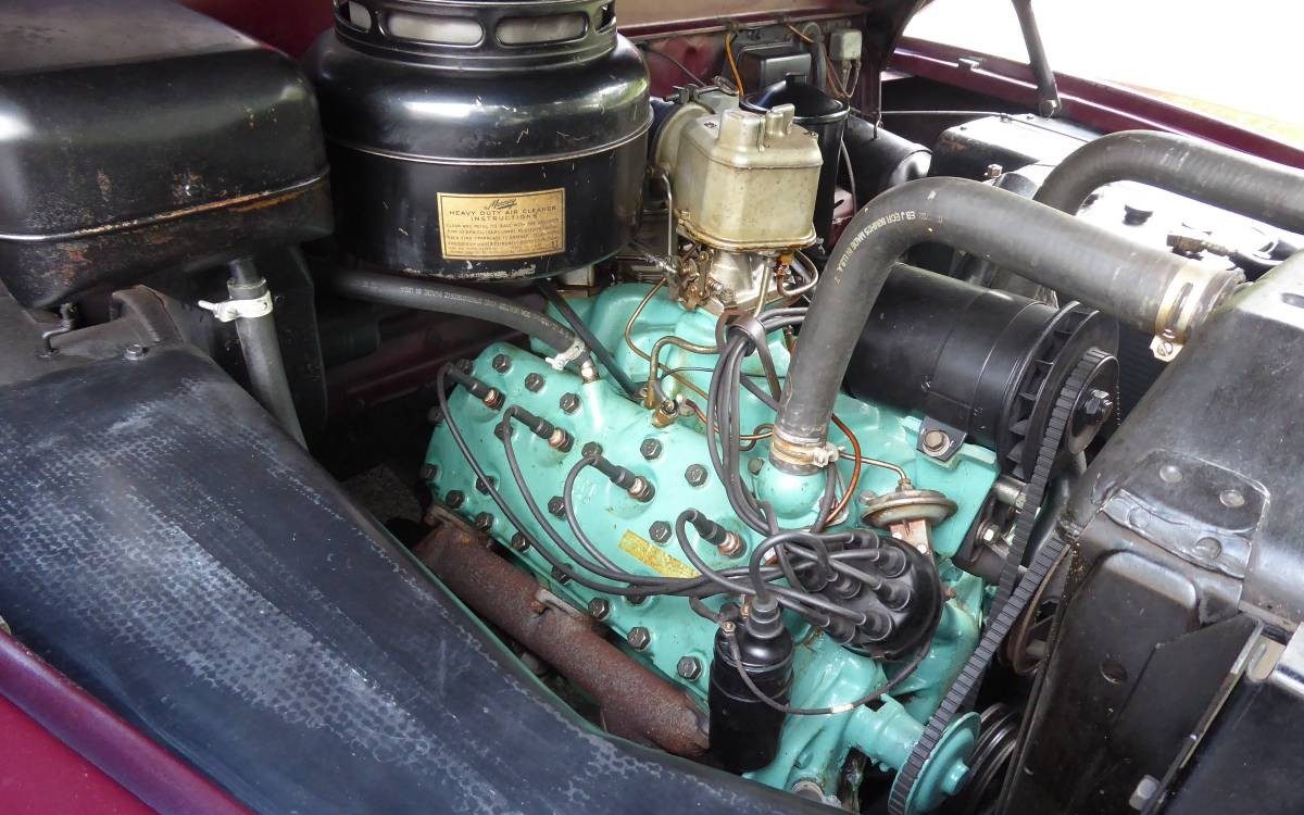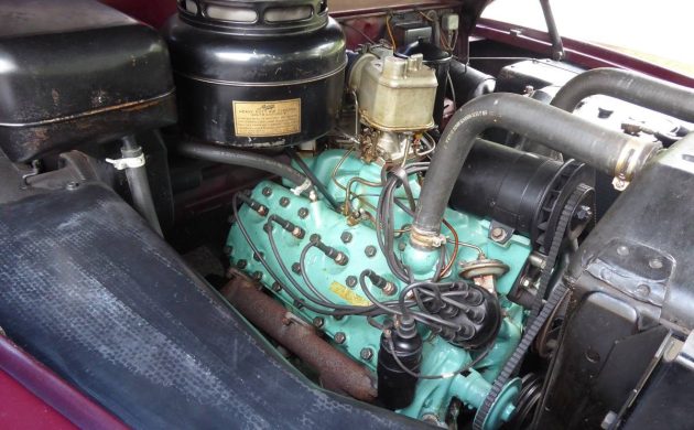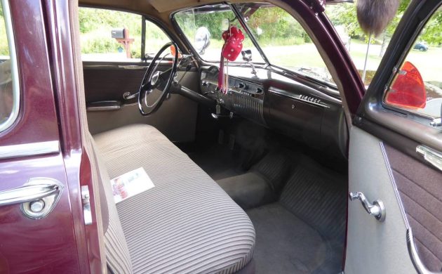 If the T-handle below and to the right of the steering column is to be believed, this Mercury has the overdrive option, which afforded a 4.27:1 axle ratio compared to the stock 3.90s. The interior is wonderful, and the fabric matches the factory literature. The seller believes that the car’s “Royal Maroon” paint may be original; it would be almost unbelievable if the interior was. If it has been redone, it appears to have been done well.